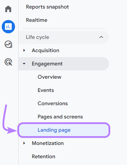 Go to "Landing page" within the "Engagement" section of your "Life Cycle" reports.