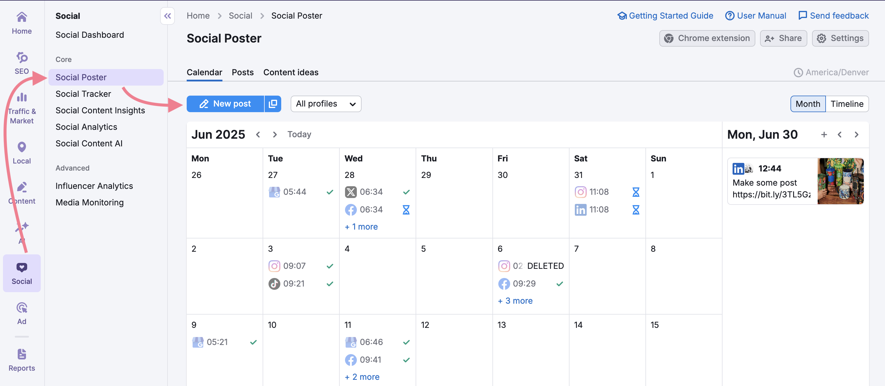 Connect your social accounts, and head to the “Calendar” tab within the Social Poster tool. Here you'll find a comprehensive calendar view of all your scheduled posts, allowing you to visualize your content plan and make adjustments on the fly with simple drag-and-drop functionality