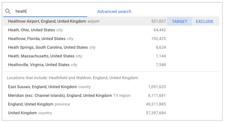Once you click “Advanced Search”, you will see a pop-up window, where you can search for locations to target or exclude, including search by radius, which is also called proximity targeting.